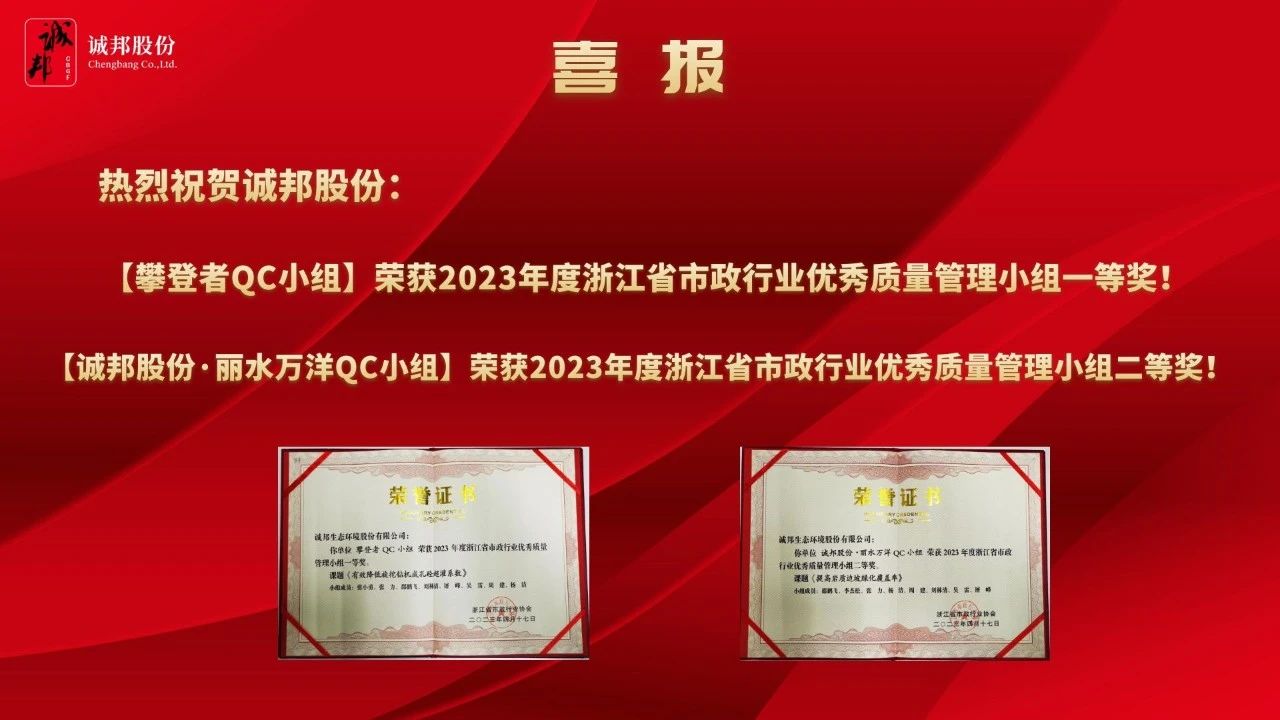 【诚邦动态·喜报】热烈祝贺诚邦股份:【攀登者QC小组】荣获2023年度浙江省市政行业优秀质量管理小组一等奖!【诚邦股份·丽水万洋QC小组】荣获2023年度浙江省市政行业优秀质量管理小组二等奖!