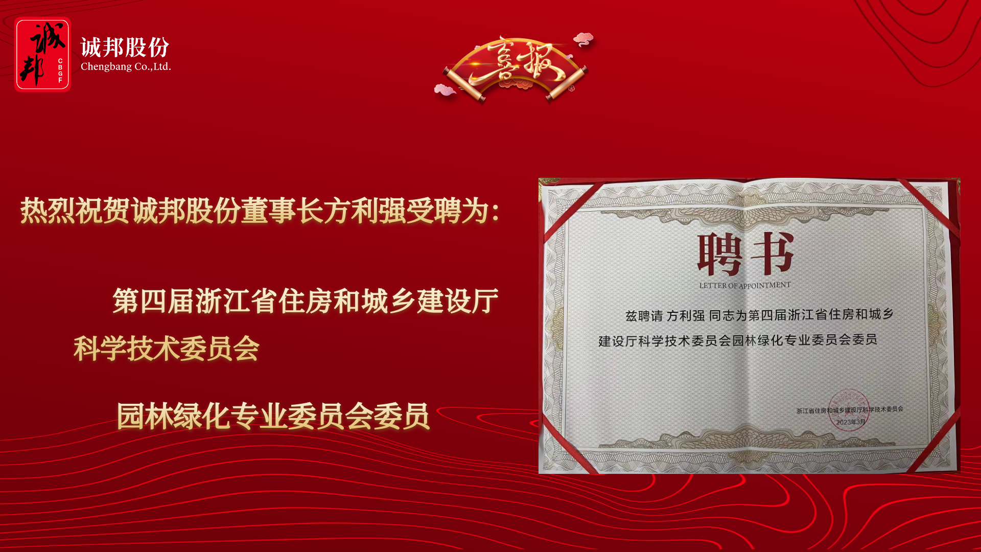 【喜报】 热烈祝贺诚邦股份董事长方利强受聘为:第四届浙江省住房和城乡建设厅科学技术委员会园林绿化专业委员会委员。