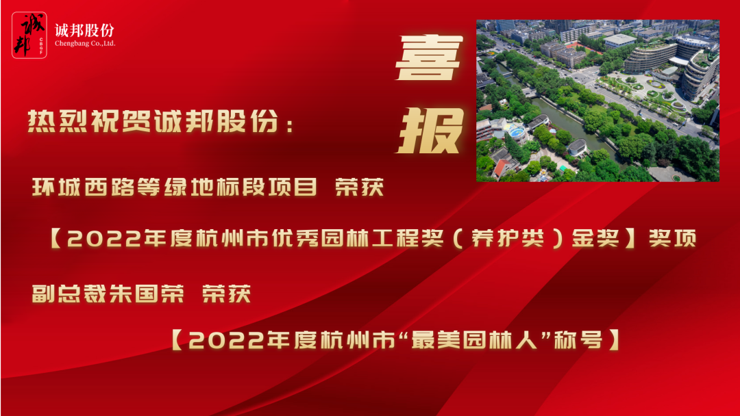 热烈祝贺诚邦股份项目荣获2022年度杭州市优秀园林工程奖(养护类)金奖!公司副总裁朱国荣荣获2022年度杭州市最美园林人称号!