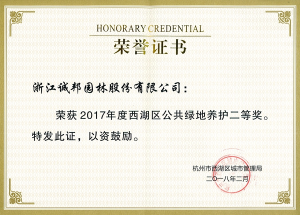 诚邦股份荣获西湖区公共绿地2017年度考核二等奖