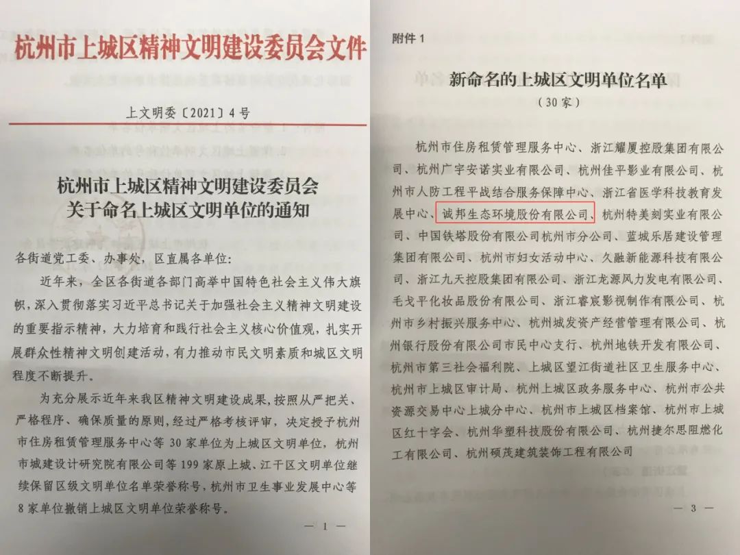 · 获 奖 喜 报 · 经杭州市上城区精神文明建设委员会考核评审,诚邦生态环境股份有限公司被授予上城区 #文明单位#荣誉称号。