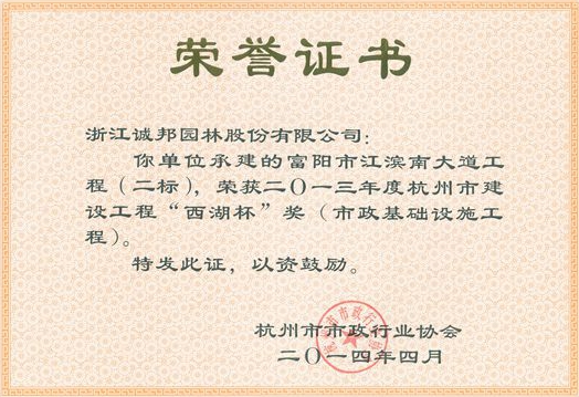 富阳市江滨南大道工程(二标)荣获2013年度杭州市“西湖杯”优质工程