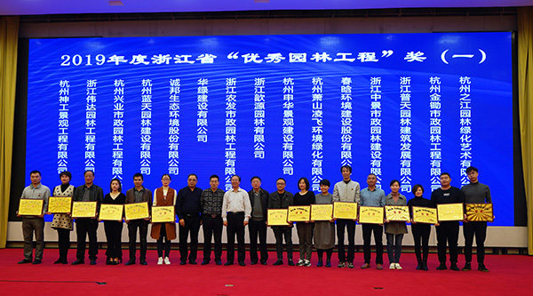 由我司承建的“桐庐县富春江水利风景区滨水风光带(洋州段)景观工程—C标段/活动区及护坡改造工程)”、“韩风国际城市政与景观一期工程”两个项目荣获2019年度浙江省“优秀园林工程”金奖,公司副总裁彭水生、总裁助理朱国荣代表公司上台领奖。