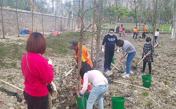 共有18家单位,32个家庭自发成组、协同合作,一起挖坑、立树、培土、浇水,认真种好每一颗树木,一个个忙碌的身影交织成一幅幅生动的画面,经过一番热火朝天的劳动,六十二株树苗围绕公园,迎风挺立,