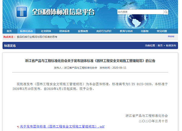 该标准经过充分调研、立项申报、研讨论证,形成征求意见稿在有关部门广泛征求意见,并修改完善,已通过浙江省产品与工程标准化协会发布,自2020年4月1日起实施。