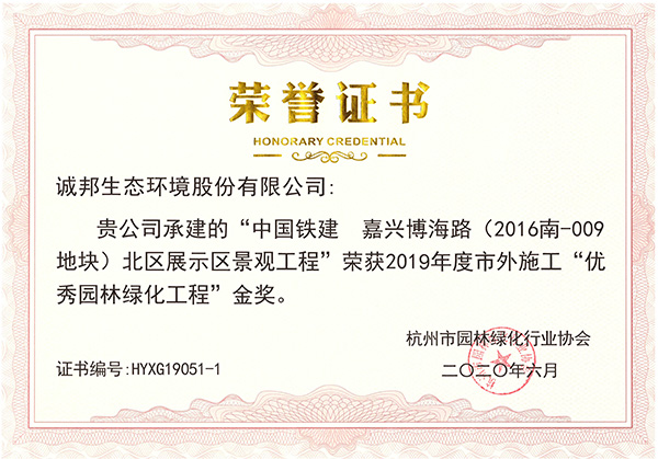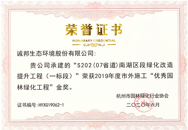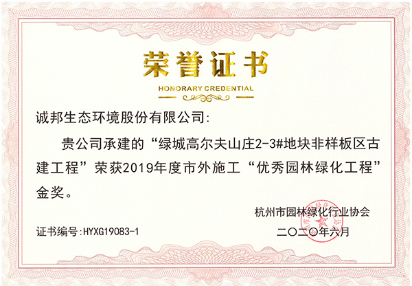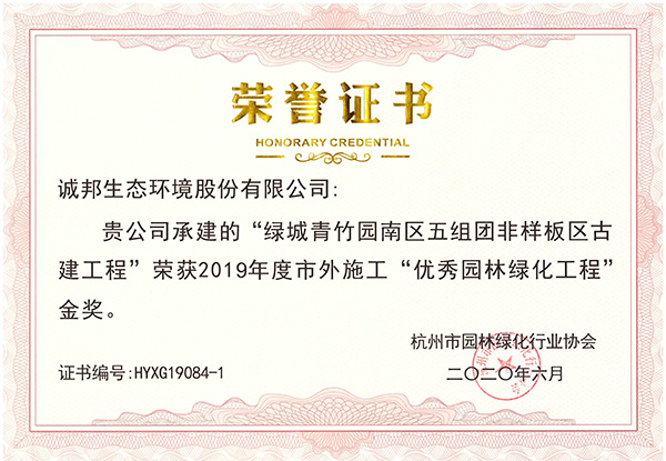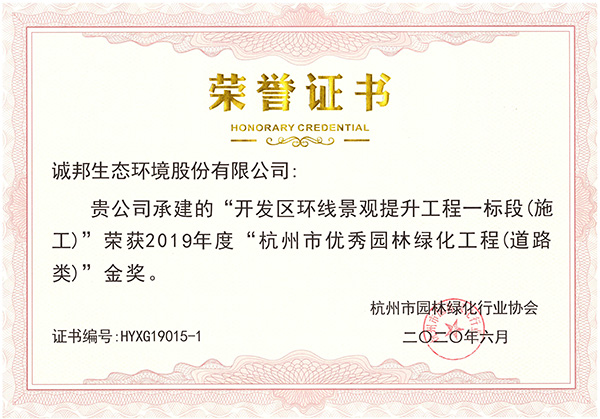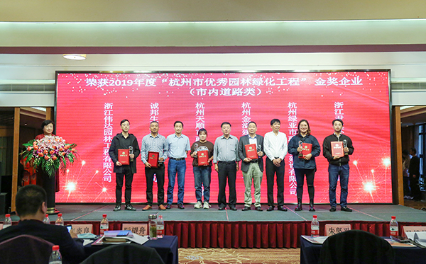 本次大会公司收货颇丰,由我司承建的工程共斩获六个金奖,分别是“开发区环线景观提升工程一标段(施工)”荣获 2019年度“杭州市优秀园林绿化工程(道路类)”金奖,“绿城桃李春风一期5组团古建工程”荣获 2019年度“杭州市优秀园林绿化工程(综合类)”金奖,“绿城高尔夫山庄2-3#地块非样板区古建工程”“绿城青竹园南区五组团非样板区古建工程”“中国铁建 嘉兴博海路(2016南-009地块)北区展示区景观工程”“S202(07省道)南湖区段绿化改造提升工程(一标段)”四个项目荣获 2019年度市外施工“优秀园林绿化工程”金奖。