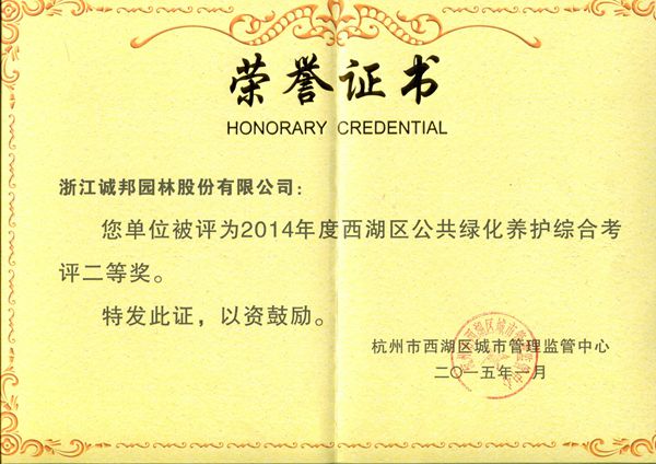 2015年1月30日,西湖区城管局绿化工作年度总结大会顺利召开,我公司荣获了2014年度西湖区公共绿化养护综合考评二等奖。