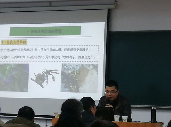 下午高博士主讲了《园林植物虫害的生物防治》,从园林植物虫害防治的现状以及对环境造成的负面影响,引出为什么要使用生物防治。详细介绍了害虫生物防治的原理、园林害虫的发生特点、园林害虫的防治技术、存在的问题及未来的发展预估。