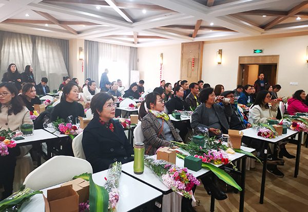 下午,协会安排了DIY插花课程,特邀插花花艺大师、杭州市园林文物局灵隐管理处(杭州花圃)旅游管理科科长戴志祥先生授课,老师向大家介绍了插花艺术的基本知识,并示范了各种造型的插花制作方法。大家边学边做,互相交流,发挥创意将花材修剪、搭配制作成花束,完成了19年第一盆属于自己的插花作品!