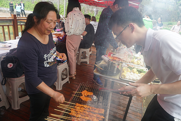 到了目的地,大家分工合作,搬烧烤架、取炭火食材,组织烧烤。