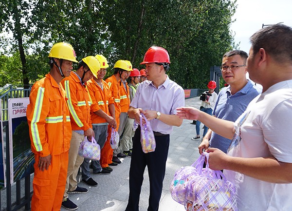 骄阳似火,酷暑难当,杭州市园林文物局领导心系一线员工,7月31日上午,局长高晓辉一行冒着38度的高温,带队来到我司下沙开发区环线景观提升工程一标段项目现场进行高温慰问。