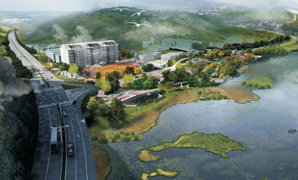场地内自然地貌较为复杂,综合考虑交通、功能、城市界面的多维度融合,着重打造东西向的山水景观文化轴和南北向的城市形象展示轴。总体延续工业山水画卷的主题进行展示,因地制宜,因山就势,因水而变,分别赋予两块场地不同的主题,从总体来看又是你中有我,我中有你的互融有机整体。